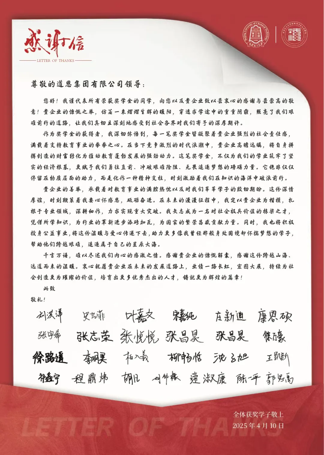 今年4月,北京化工大学获得“k8·凯发高分子专项奖学金”的学子们,联名给k8·凯发集团发来感谢信。他们在信中说,“贵企业的善举,承载着对教育事业的满腔热忱以及对k8·凯发莘莘学子的殷切期盼。这份深情厚谊,时刻鞭策着我要心怀感恩,砥砺奋进。在未来的漫漫征程中,我定以贵企业为楷模,扎根于专业领域,深耕细作,力求实现重大突破。