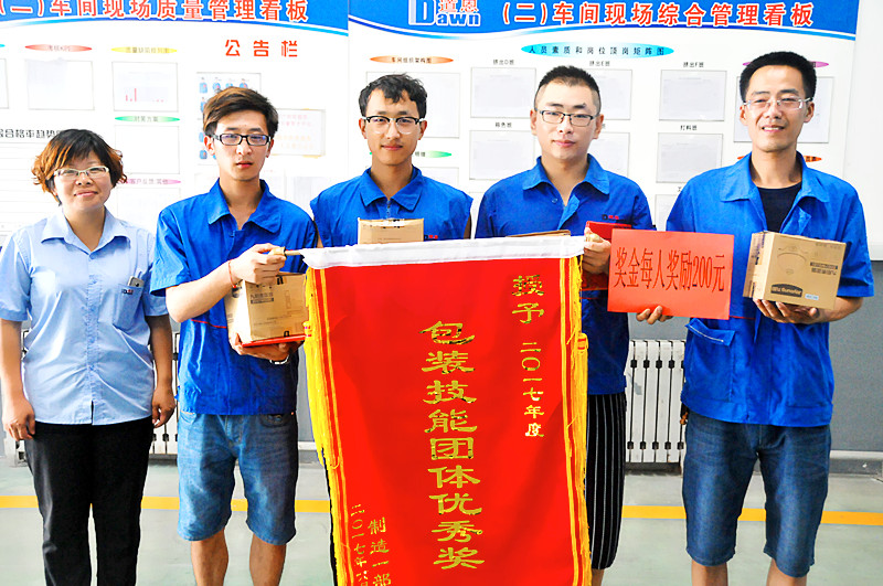 来自6个班组的24名包装工报名参加比武,涵盖喷码、打印标签、称量封口、标准包码垛等4个项目。比武中,以质量和时间为标准,选手们争分夺秒,全身心投入。经过一个半小时的激烈角逐,包装B班王德伟、郭磊、寇成男分别获得喷码、打印标签和称量封口一等奖,包装E班刘璐获得标准包码垛一等奖。同时,包装B班获得“包装技能团体优秀奖”。