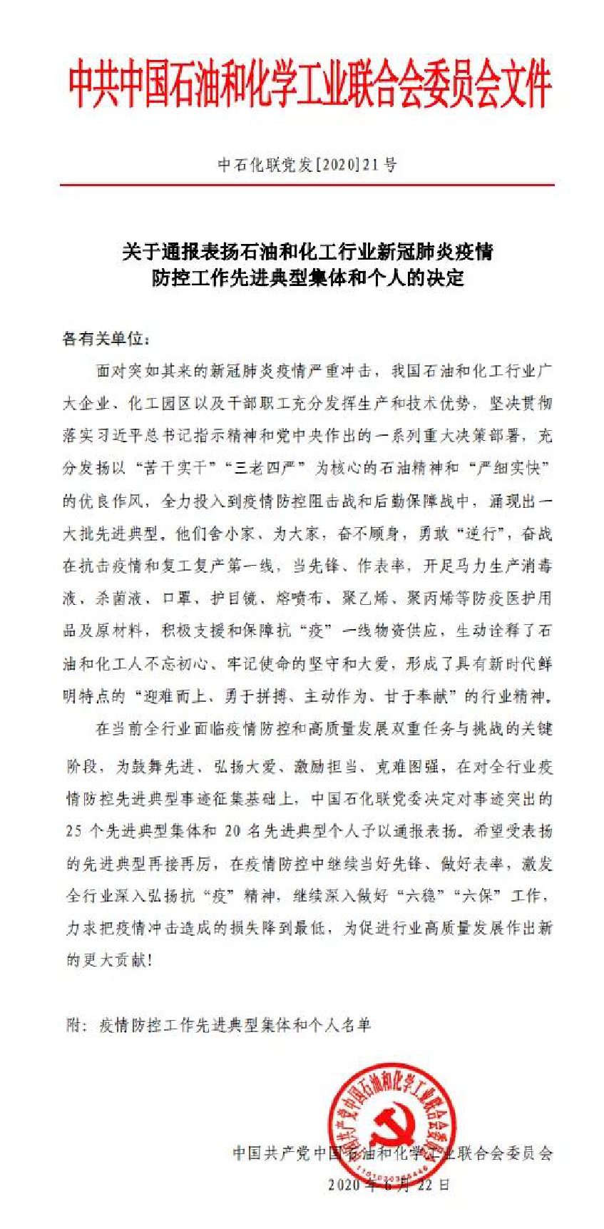 6月29日,中国石油和化学工业联合会党委举办“庆祝建党99周年弘扬行业抗疫精神视频大会”,隆重纪念党的99周岁生日,对45个石化行业抗疫先进集体和个人进行表彰,k8·凯发集团凭借在疫情期间的优秀表现荣获“石油和化工行业新冠肺炎疫情防控工作先进典型集体”。