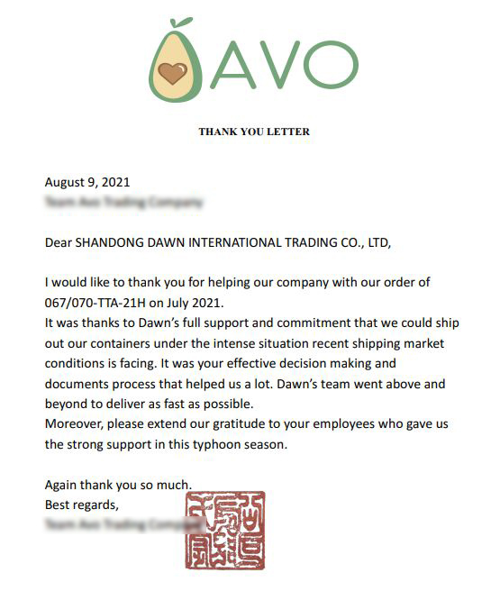 “衷心感谢工厂连夜装箱赶在台风威胁下准时进港,以及操作人员将文件及流程安排妥当。另外,也感谢我公司无法对接的人员们对我公司的帮助。”感谢信说,“如此耐心配合与帮助,给予我公司极大的助力,以及万分的安心。愿一如既往加强联系,进行更广泛、更友好的合作关系。”