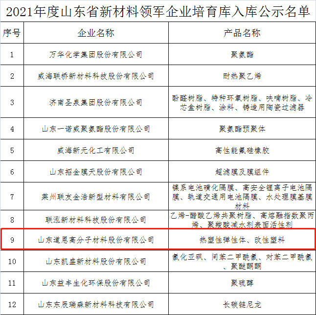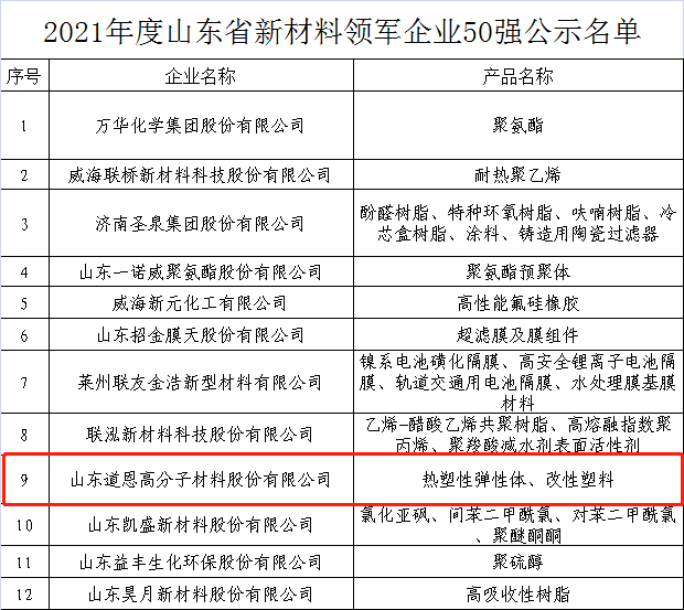 日前,2021年度山东省新材料领军企业培育库入库名单和2021年山东省新材料领军企业50强名单出炉。k8·凯发股份的热塑性弹性体、改性塑料入围上述榜单。