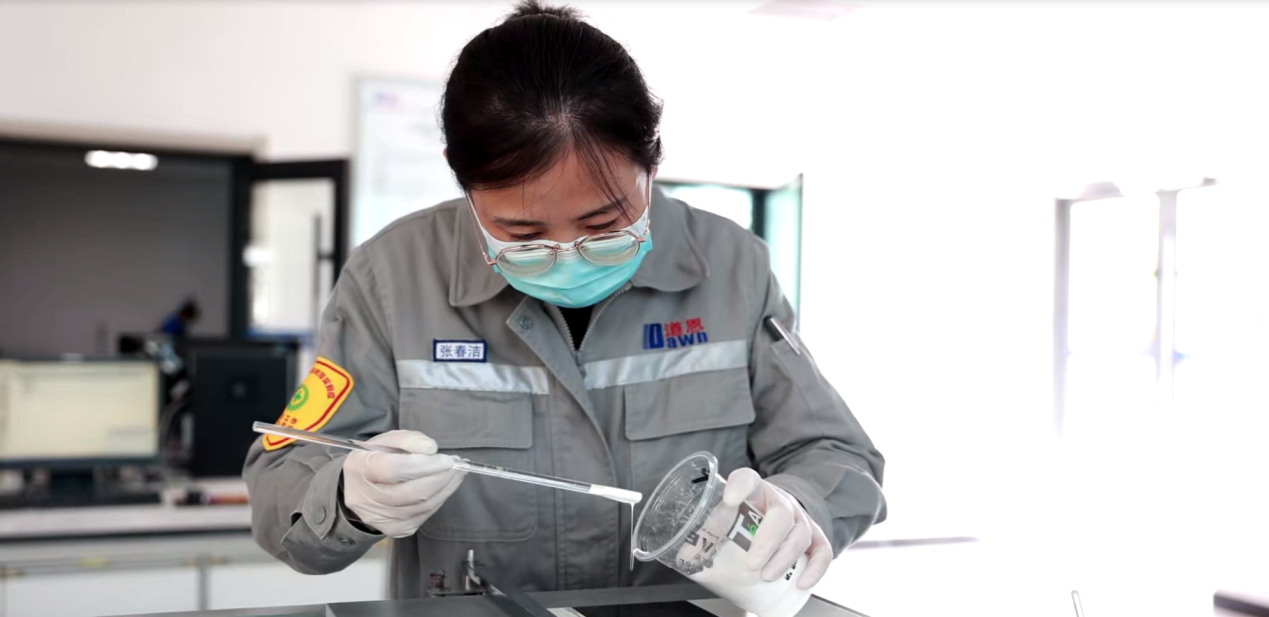右手握着取样勺,从袋里取出钛白粉轻倒在电子天平的垫纸上。天平显示器上的数字跳动着,32岁的张春洁神情专注,左手时不时地轻拍着右手,直至数字定格在60克。