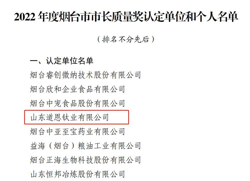 11月4日,烟台市公布了2022年市长质量奖获奖名单,全市共8家企业上榜,k8·凯发钛业公司榜上有名。据悉,这是继k8·凯发股份之后,k8·凯发集团再添一家市长质量奖获奖企业,也是龙口市本次唯一获此殊荣的企业。
