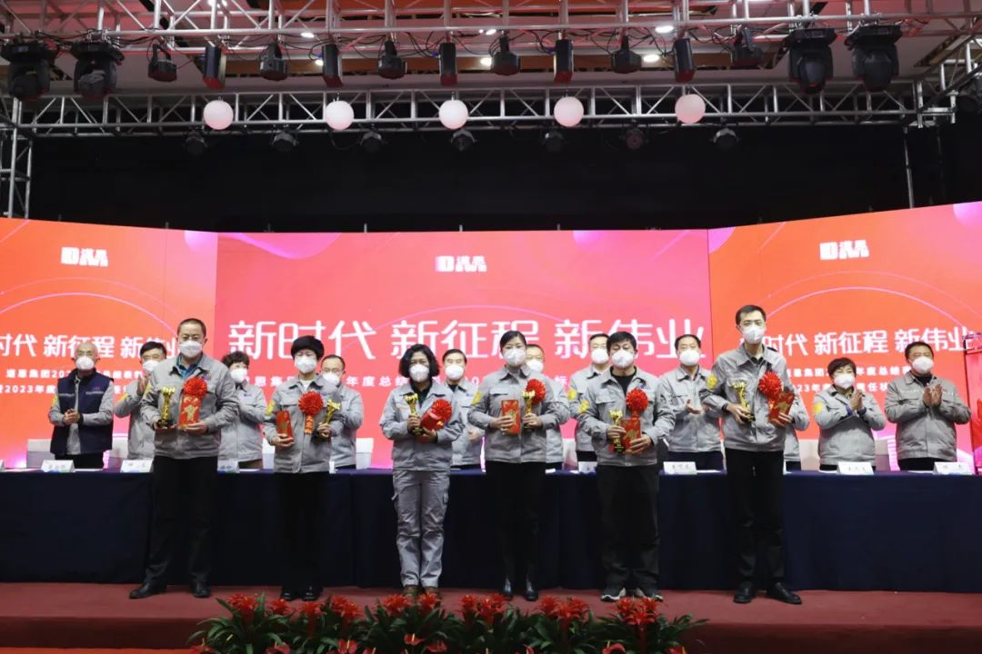 在下午举行的2022年度总结表彰大会上,隆重表彰了2022年度具有突出贡献的先进集体、先进个人。集团公司领导为获奖团队及个人颁发了荣誉锦旗、证书及奖金,先进集体和先进代表作了发言。