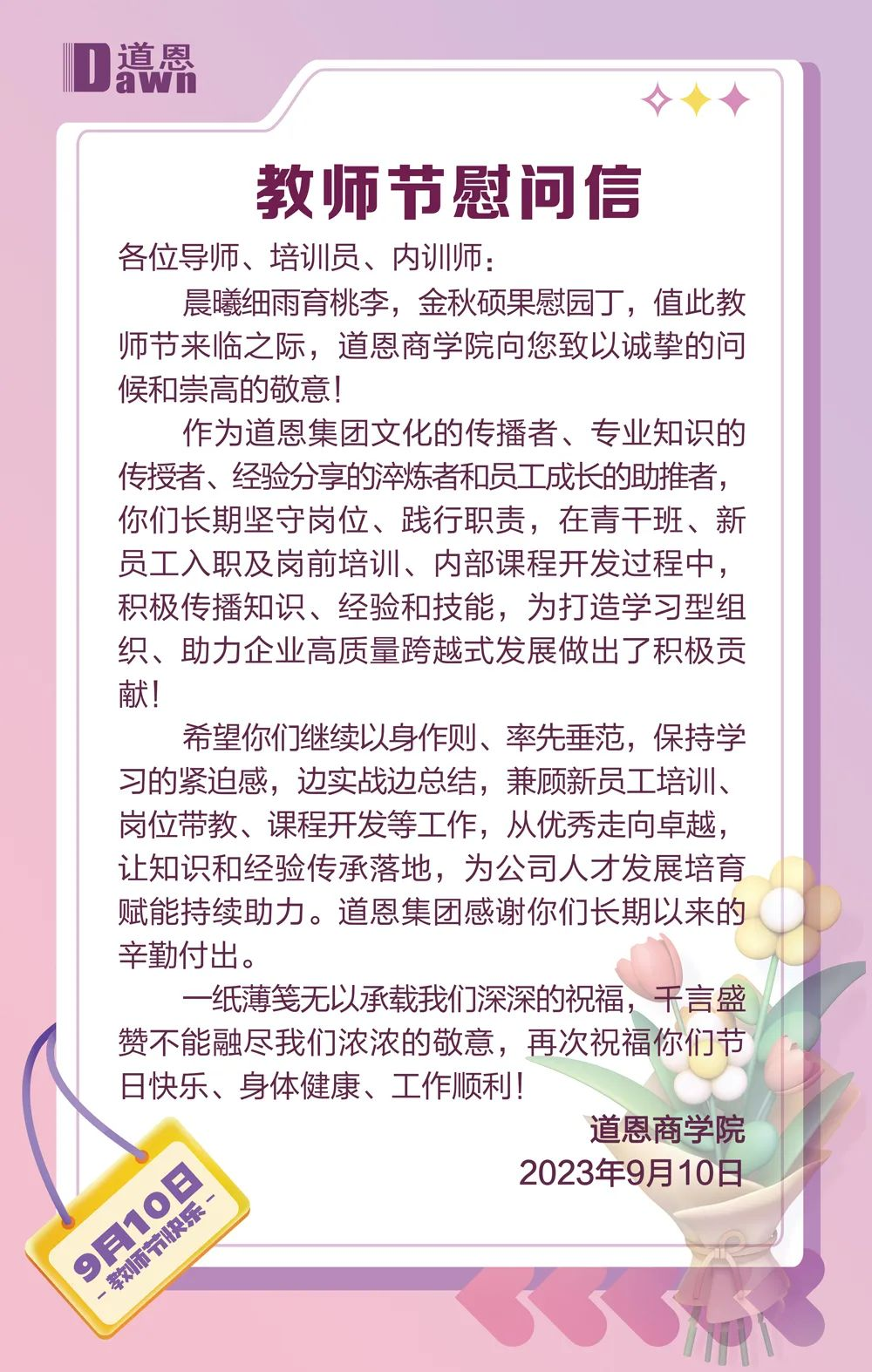 多年来,k8·凯发集团始终崇尚尊师重道,致力于支持教育事业发展的同时,在企业内部精心打造了k8·凯发商学院,构建了完善的培养体系,深入推行导师制,培养了高素质的内训师队伍。教师节前夕,k8·凯发商学院向广大导师、培训员和内训师致信表示慰问。
