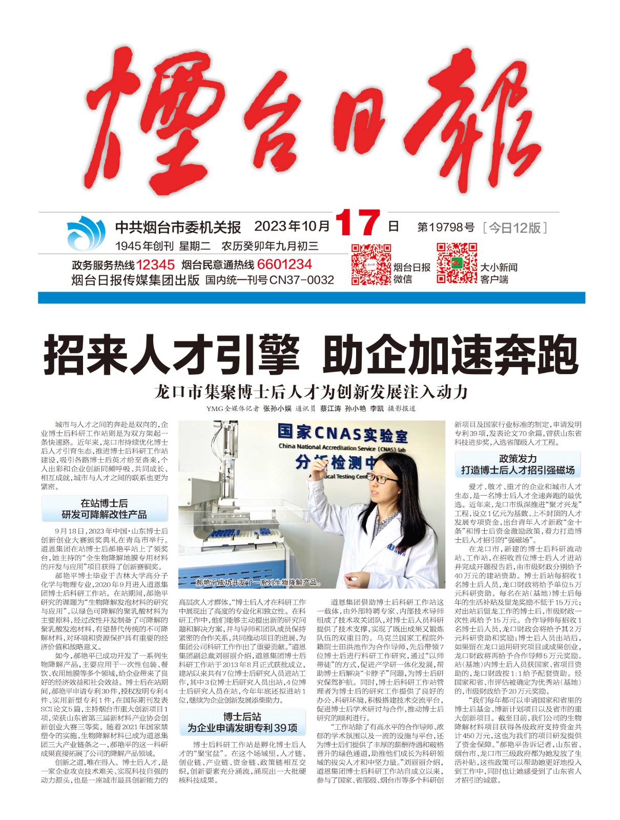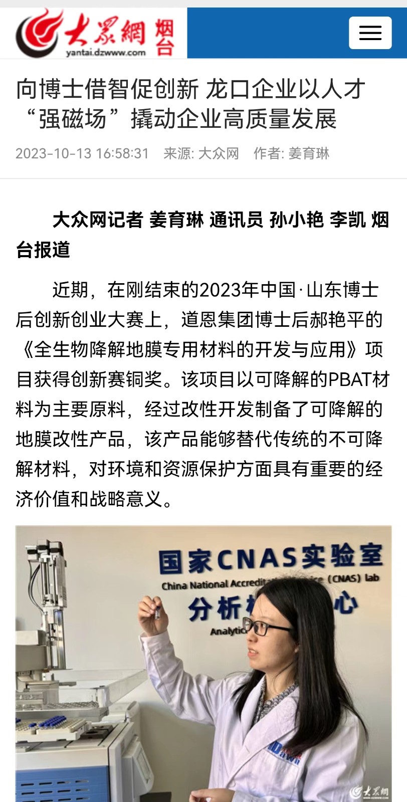 此前的9月18日,2023年中国·山东博士后创新创业大赛颁奖典礼在山东省青岛市举行。k8·凯发集团在站博士后郝艳平站上了领奖台,她主持的“全生物降解地膜专用材料的开发与应用”项目获得了创新赛铜奖。据悉,这是龙口市唯一获奖的博士后工作站项目。
